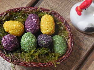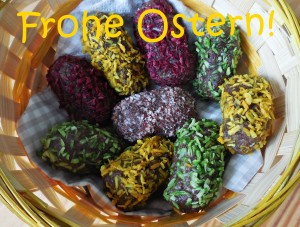 Diese Idee entstand während ich die bunten Ostereier machte und die weiße Kokosmasse neben der Kurkuma-Kokosmasse sah. Zack, die Eier-Assoziation