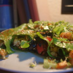 Gebt nun in die Mitte des Blattes die Füllung. Beträufelt die Füllung mit der Sauce und rollt danach das Blatt zusammen.